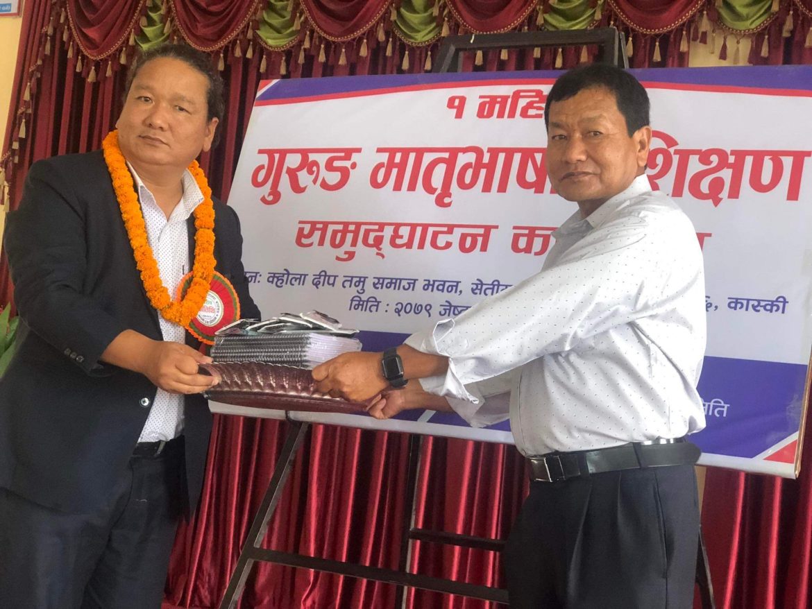 तमु प्ये ल्हु संघ केन्द्रीय समितिका अध्यक्ष हितकाजी गुरुङको अध्यक्षतामा आयोजित कार्यक्रममा गण्डकी प्रज्ञा प्रतिष्ठानका उपकुलपति गोरे गुरुङ, सदस्य सचिव मनकुमार श्रेष्ठ, प्राज्ञ कृष्ण प्रसाद पौडेल, तमु प्ये ल्हु संघ कास्कीका अध्यक्ष निम बहादुर गुरुङ, ओम बहादुर गुरुङ, हर्क गुरुङ लगायतले मातृभाषा प्रशिक्षण कार्यक्रमको आवश्यकताको बारेमा बोलेका थिए ।